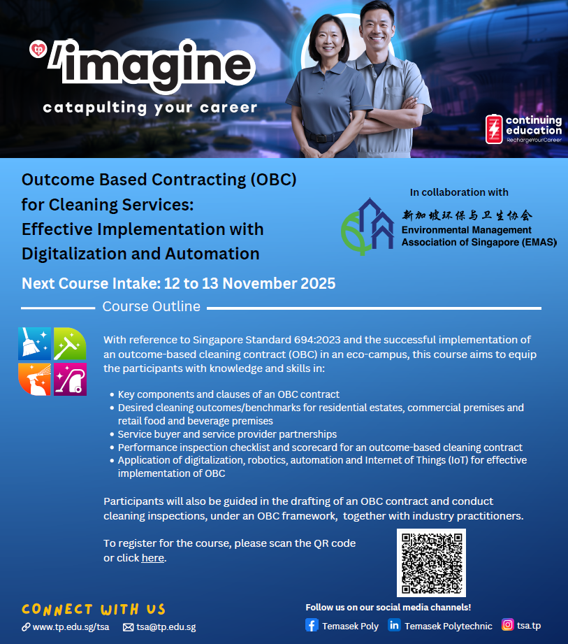 With reference to Singapore Standard 694:2023 and a successful implementation of outcome-based cleaning contract in an eco-campus, this course aims to equip the participants with knowledge and skills on: